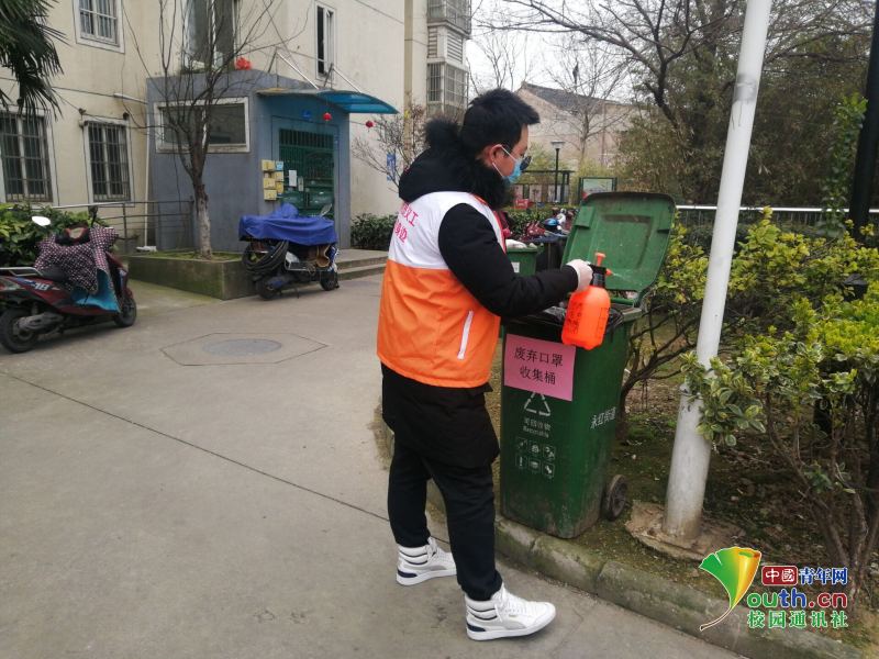 17级海洋工程与技术专业的学生沈奕对小区垃圾桶进行消毒,为社区的居民的健康安全多增添一份保障。