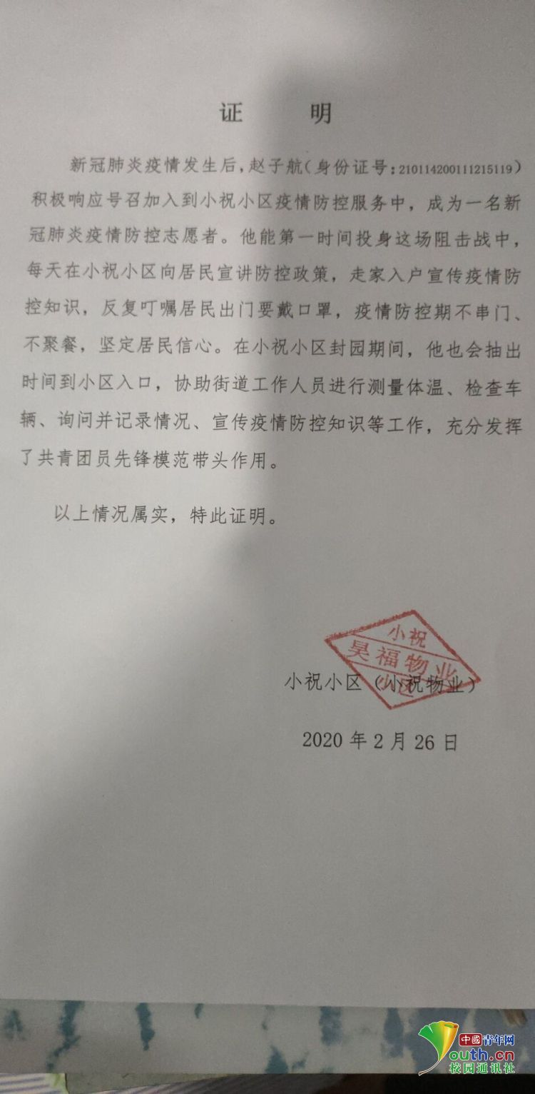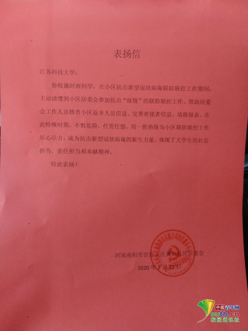 “我们这些‘90’后、‘00’后是在新时代、新环境下成长起来的,也曾被称为温室里的花朵,但在这场突如其来的疫情中,我们有责任也有义务为国家做一些事情。”获得疫情防控工作“先进个人”的施时雨说到。在社区一线做志愿工作的二十多天里,她为社区的防控做出了突出贡献,荣获了社区的表彰。表彰信上,社区对施时雨同学积极投身疫情防控工作的精神给予高度赞扬。突出表扬了她在二十多天来连续奋战,锐意不减,主动牺牲自己的时间,克服工作量大、工作时间长等困难。
