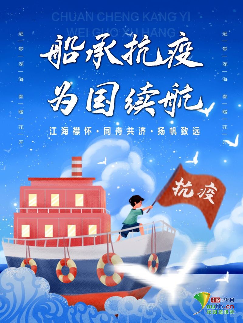 2020年原本的美好被一场突如其来的疫情所打破,图中“船承抗疫,为国续航”这八个大字十分吸引人的眼球,图中蔚蓝的天空和大海象征着梦幻、愿望和期待,表现出人们对抗疫胜利充满着信心,洁白的海鸥在海面上尽情翱翔,蕴含着希望。图中的轮船,在朵朵浪花的簇拥之下向前航行,船上的人热情的挥动着写着大大的写着“抗疫”二字的旗帜。在此次抗击新冠肺炎疫情的战疫中,船海学院也涌现出一大批走在抗疫前线的志愿者们,在国家和人民最需要的时候,做出无怨无悔的选择,成为最美逆行者。他们同舟共济、团结一心,一起向着希望的远方航行。