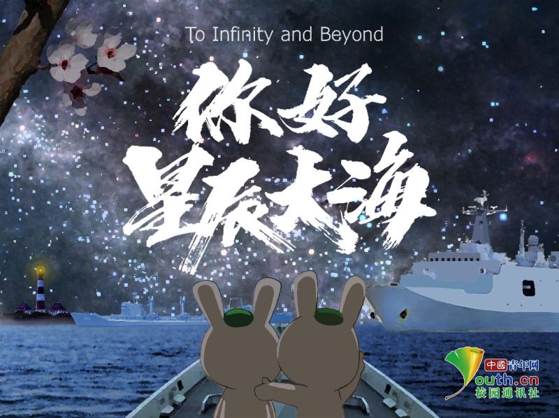 作品元素由近及远,一一错落铺陈,以青年人喜爱的充满活力的动漫画风:兔子、大海、星空、中国海军的主力舰艇以及用刚劲笔法书写的“你好,星辰大海”字样融合于一幅图画之中,并在左上角附以盛开的樱花一枝,象征着不论经历重重磨难,我们始终会迎来春天,明天依然会像春天般充满盎然生机而富有希望。作品集中展现了船海人以仰望星辰大海为理想,以脚踏实地实现国家富强、民族复兴为己任,以满怀热情、坚强乐观为高尚情怀,努力地在逐梦路上跑出属于自己的精彩!