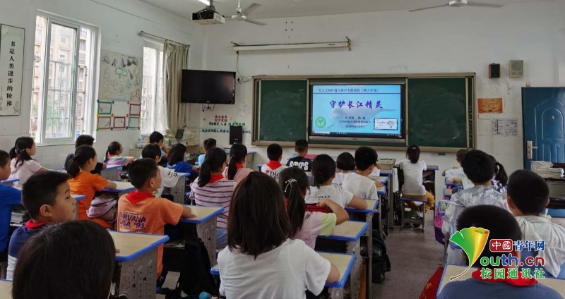 活动中,讲师先以生动的语言为同学们讲解了江豚的基础知识并和同学们一起观看了中国科学院水生生物研究所饲养的江豚水中嬉戏的视频,小江豚“悬停”“吐水”等可爱的小动作更引起了小朋友们的阵阵欢笑。