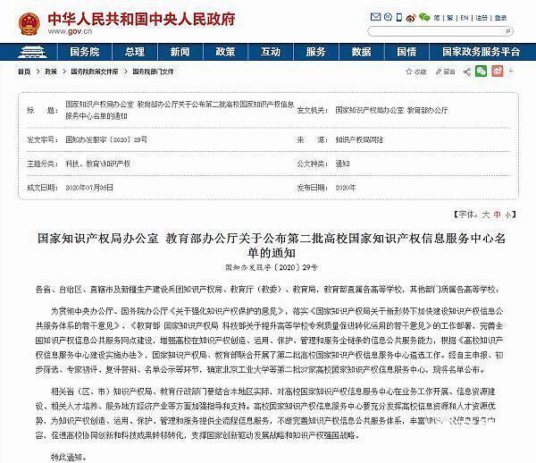据了解,为贯彻中央办公厅、国务院办公厅《关于强化知识产权保护的意见》,落实《国家知识产权局关于新形势下加快建设知识产权信息公共服务体系的若干意见》、《教育部 国家知识产权局 科技部关于提升高等学校专利质量促进转化运用的若干意见》的工作部署,完善全国知识产权信息公共服务网点建设,增强高校在知识产权创造、运用、保护、管理和服务全链条的信息公共服务能力,根据《高校知识产权信息服务中心建设实施办法》,国家知识产权局、教育部联合开展了第二批高校国家知识产权信息服务中心遴选工作。