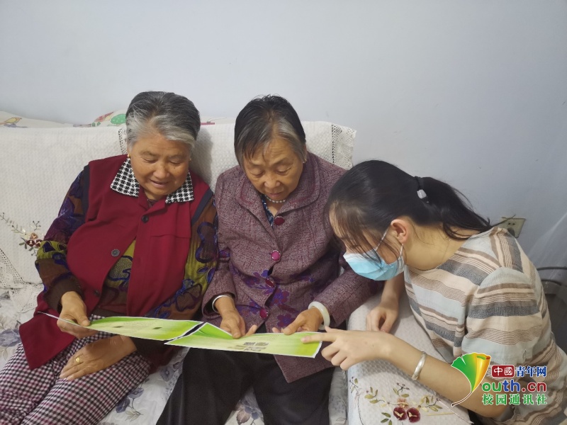 图为团队成员向社区老人介绍粮食储藏知识。中国青年网通讯员 金柯 摄