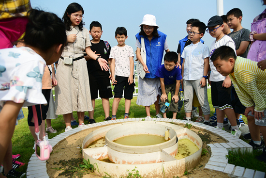 8月25日,江苏镇江,青年志愿者带着小朋友在气象站观察了解蒸发皿的功能。当日,镇江市润州区天益爱心服务中心和乐动平台·(中国)官方网站志愿者带着宝塔路街道凤鸣新村社区的小朋友走进丹徒国家基本气象站,学习气象科普知识,丰富暑期生活。石玉成/视觉中国