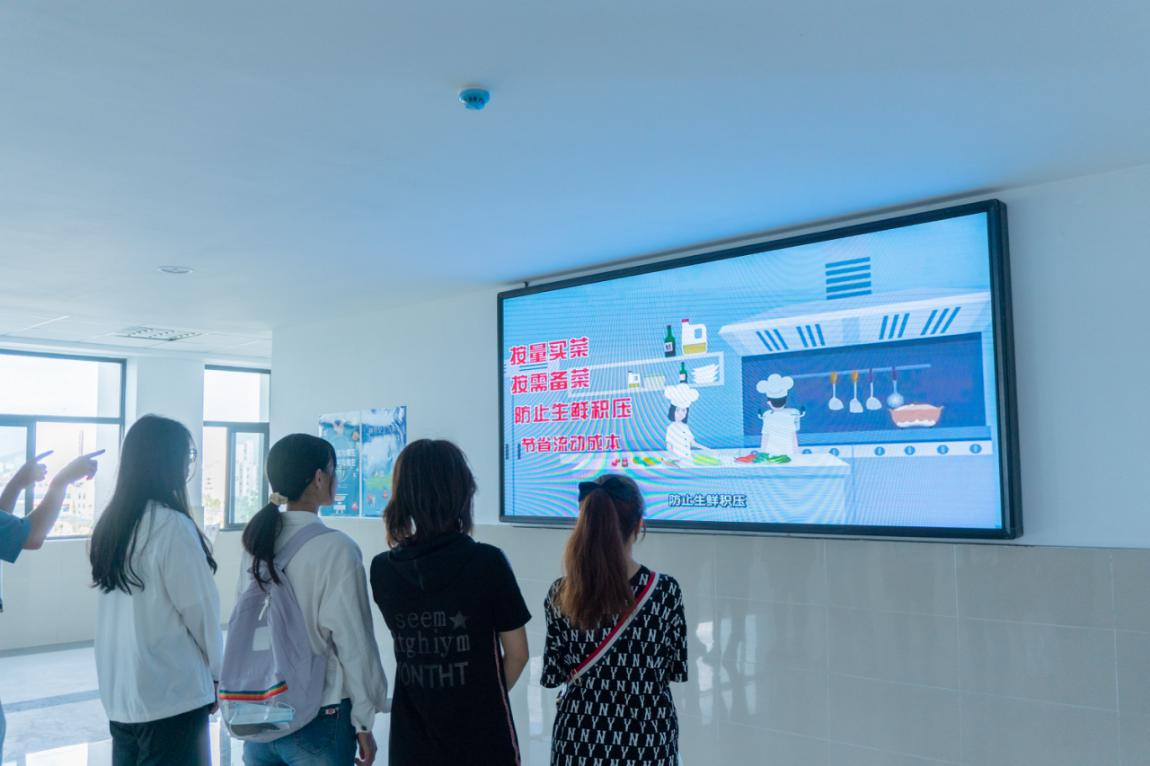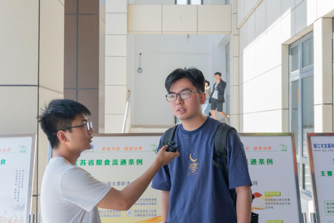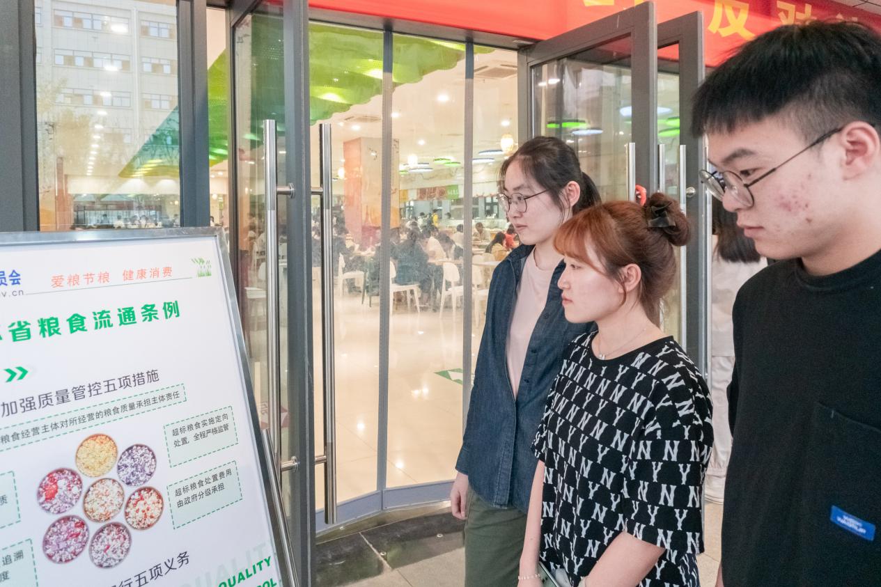 大屏幕前,循环展播着00后大学生自己制作的“谁知盘中餐粒粒皆辛苦”科普短片吸引一众学生围观学习,各种餐饮节约小知识引导大家减少餐桌、餐盘剩饭菜现象;来往学校餐厅的学生们驻足观看节粮爱粮海报,了解粮食流通条例、学习“坚决制止餐饮浪费”倡议书、粮油健康消费常识等内容。计算机学院的刘源同学表示:“刚刚吃完饭经过这里,看到这么多海报,很有意思,同时也学到了好多有用的食品安全和粮食节约小知识,我觉得厉行节约,反对浪费应该成为每个公民的自觉意识。”