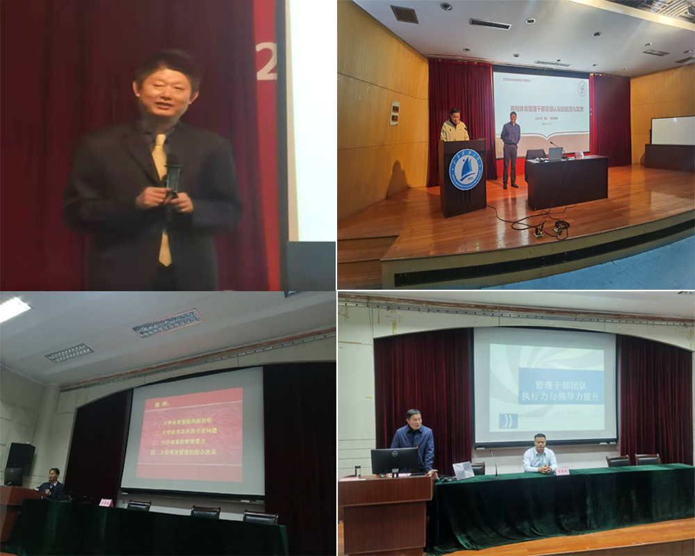上海大学体育学院院长、博士生导师刘兵教授,华东理工大学体育科学与工程学院院长、博士生导师王跃教授,慧泉咨询创始人、盛威国际(中国)控股集团企业商学院郝泉刚院长,山东大学体育学院院长、博士生导师孙晋海教授,分别作了题为《高校体育管理干部认知应然与突然》、《体育突发事件的危机管理》、《卓越领导能力》和《大学体育促进的管理思考》的报告,以上4位专家对自己讲授的题目进行了深度的剖析,结合自身的体会,用很多创新理论和案例解决了实践过程中遇到的问题与困难,专家们用别开生面的肢体语言,诙谐幽默的典型事例,从不同的视角,不同的维度,不同的平台,多学科交叉融合为学员们提供了丰富的体育管理“营养大餐”。