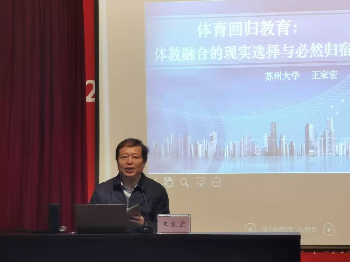 国务院学位委员会、体育学科评议组成员,教育部体育教学指导委员会技术组组长、苏州大学原校长助理、博士生导师王家宏教授首先作了题为《体育回归教育:体教融合的现实选择与必然归宿》的报告,王家宏教授从《关于深化体教融合促进青少年健康发展的意见》入手,围绕青少年在体育锻炼中享受乐趣、增强体质、健全人格、锤炼意志、德智体美劳全面发展来展开,用《关于全面加强和改革新时代高校体育工作的意见》来推进青少年健康的发展,让大家进一步了解了体育、教育、健康三者的关系,整个报告高屋建瓴、主题鲜明、内容丰富。