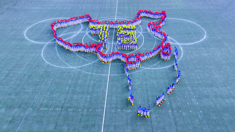 由校工会组织,来自全校23个基层工会的300余名教职工带来了八段锦全民健身运动项目展演。伴随着五彩斑斓彩带龙的翻飞盘旋,大家气定神闲地舒展肢体,动静之间,皆成风景,传达了我校教师快乐工作、健康生活的理念。最后红黄色花朵汇聚成爱心定格出“91”数字,与彩带龙构成的“JUST”交相辉映,献礼学校办学91周年。